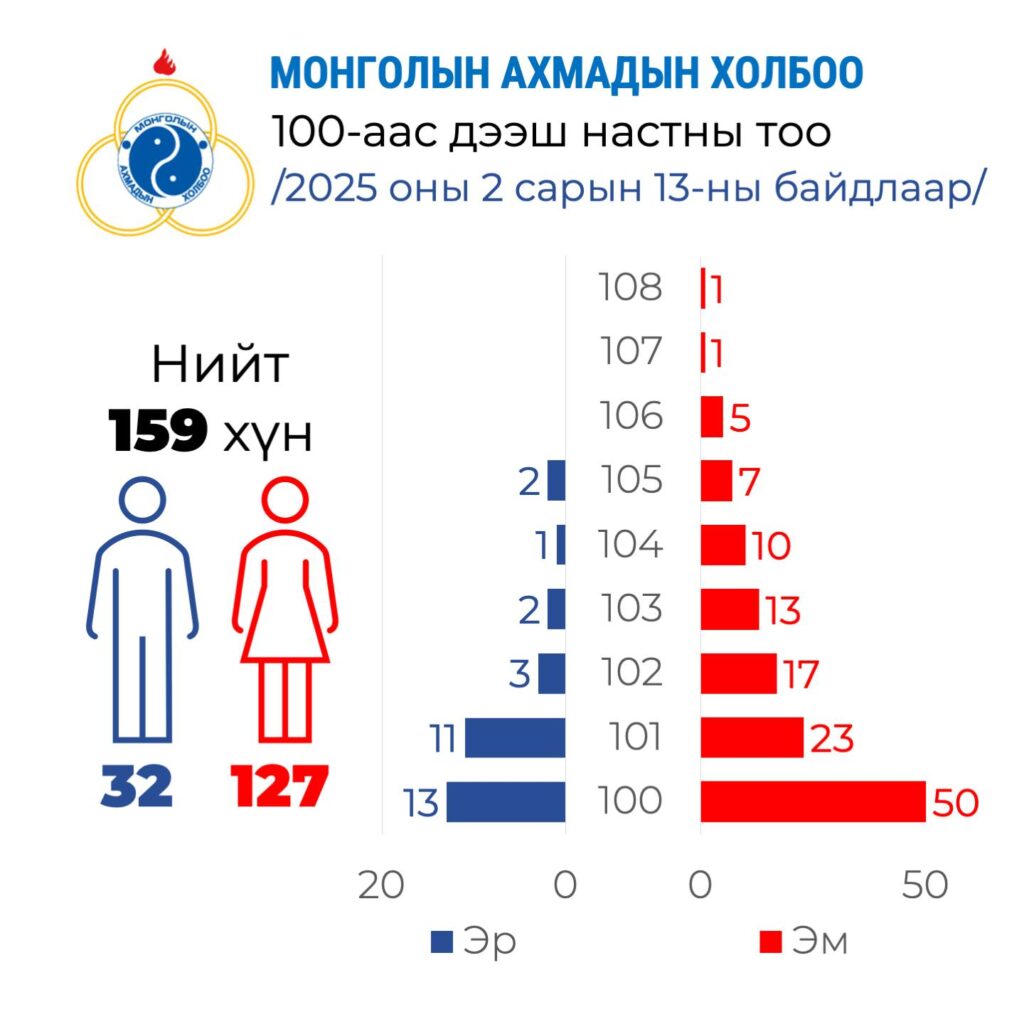 Монгол Улсад 100 болон түүнээс дээш насны нийт 159 иргэн бүртгэлтэй байна. Үүний 127 нь эмэгтэй, 32 нь эрэгтэй иргэн байна. Нийслэл Улаанбаатарт 70, аймгуудад 89 иргэн амьдарч байгаа бөгөөд хамгийн өндөр настай ахмад нь 108 настай байна. 100-аас дээш настай ахмадын тоогоор Өвөрхангай аймаг 11 иргэнтэйгээр тэргүүлж, Баян-Өлгий аймаг 8 иргэнтэйгээр хоёрдугаарт жагсаж байна.