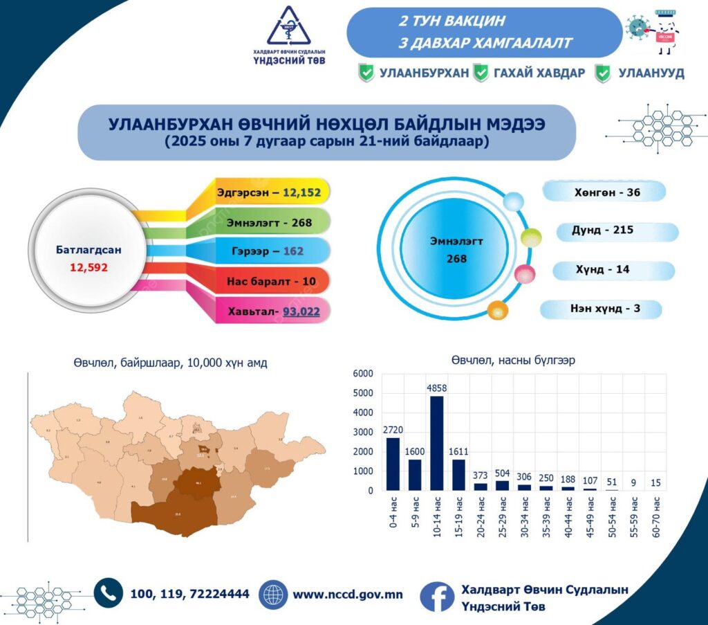 Улаанбурхан өвчний батлагдсан тохиолдол өнөөдрийн байдлаар 12 592 болоод байна. Одоогийн байдлаар уг өвчнөөс болж 268 хүн эмнэлэгт хэвтэн эмчлүүлж байгаа бол гэрээрээ 162 хүн эмчилгээ хийж байгаа юм. Эмнэлэгт эмчлүүлж байгаа хүмүүсийн 3 нь нэн хүнд байгаа бол 14 хүн хүндэвтэр байгааг ХӨСҮТ-ээс мэдэгджээ. Улаанбурханы халдвар авагсдын хамгийн олонх хувийг 10-14 насныхан эзэлж байгаа бөгөөд 0-4 насны багачуудын тоо 2720-д хүрээд байгаа нь мөн анхаарал татаж байна. Харин 50-иас дээш насны 24 тохиолдол байгаа аж.