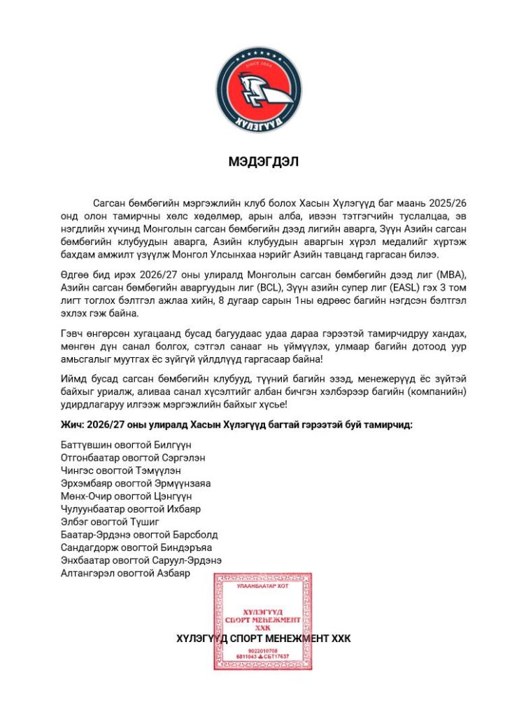 Мөн Б.Билгүүн, О.Сэргэлэн, Ч.Тэмүүлэн, Э.Эрмүүнзаяа, М.Цэнгүүн, Ч.Ихбаяр, Э.Түшиг, Б.Барсболд, С.Биндэръяа, Э.Саруул-Эрдэнэ, А.Азбаяр нарын тамирчид 2026-2027 оны улиралд “Хасын Хүлэгүүд” багтай гэрээтэй байгаа хэмээв.