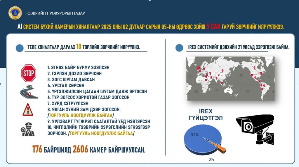 Замын цагдаагийн газрын Теле хяналт, замын хөдөлгөөний удирдлагын хэлтэс IREX буюу AI систем бүхий 2606 камерыг Улаанбаатар хотын 176 байршил, уулзварт суурилуулжээ. Дэлхийн 21 улсад хэрэглэж буй энэхүү системээр энэ оны 2 дугаар сарын 5-наас хойш замын хөдөлгөөний 5 сая гаруй зөрчил илрүүллээ. Одоогоор уг системийг туршиж буй тул жолооч нарт шийтгэл оногдуулахгүйгээр гар утсанд нь мэдээлэн сануулж байгаа аж.