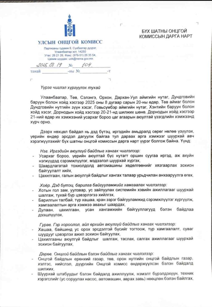 Үүнтэй холбогдуулан үерийн аюул нэмэгдэх эрсдэлтэй байгааг анхаарч, Монгол Улсын Шадар сайд, Улсын онцгой комиссын дарга С.Амарсайхан бүх шатны Онцгой комисст шуурхай арга хэмжээ авч, өндөржүүлсэн бэлэн байдлаар ажиллах үүрэг чиглэл өглөө.