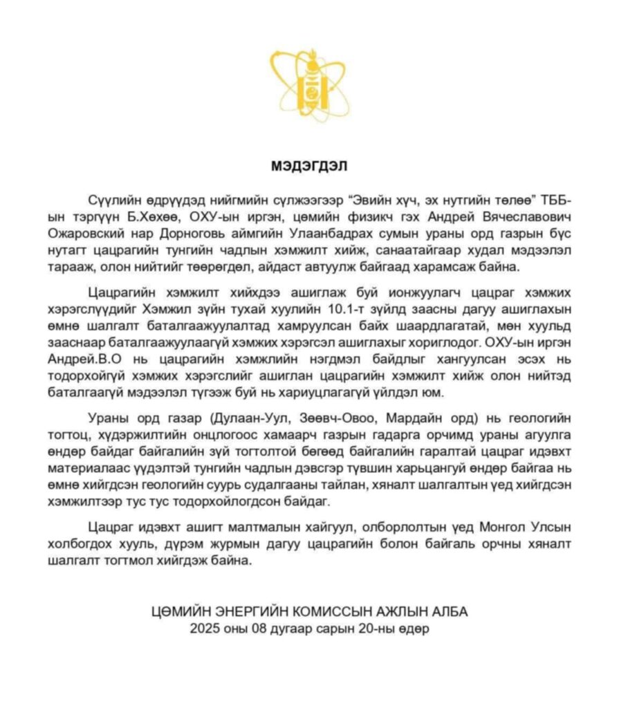 “Эвийн хүч, эх нутгийн төлөө” ТББ-ын тэргүүн Б.Хөхөө, ОХУ-ын иргэн Андрей Вячеславович Ожаровский нар Улаанбадрах сумын ураны бүс нутагт цацрагийн тун хэмжиж байгаа талаар Цөмийн энергийн комиссын Ажлын алба дараах мэдэгдлийг гаргажээ. “Эвийн хүч, эх нутгийн төлөө” ТББ-ын тэргүүн Б.Хөхөө, ОХУ-ын иргэн Андрей Вячесловович Ожаровский нар Дорноговь аймгийн Улаанбадрах сумын ураны орд газарт цацрагийн тун хэмжиж, санаатайгаар худал мэдээлэл тараан, олон нийтийг төөрөгдүүлж, айдаст автуулж байгаад харамсаж байна.