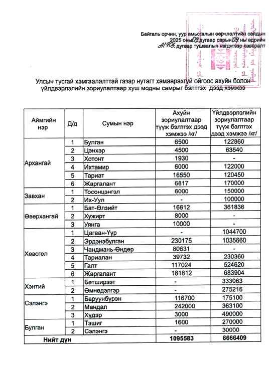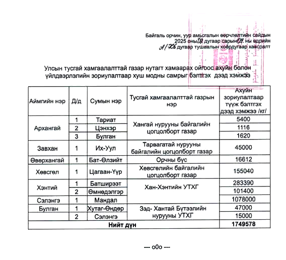 Хангай нурууны байгалийн цогцолбор газарт 8136 кг, Тарвагатайн нурууны байгалийн цогцолбор газарт 45000 кг, Хан Хэнтийн улсын тусгай хамгаалалттай газраас 1,4 тонн самар түүхийг зөвшөөрчээ.