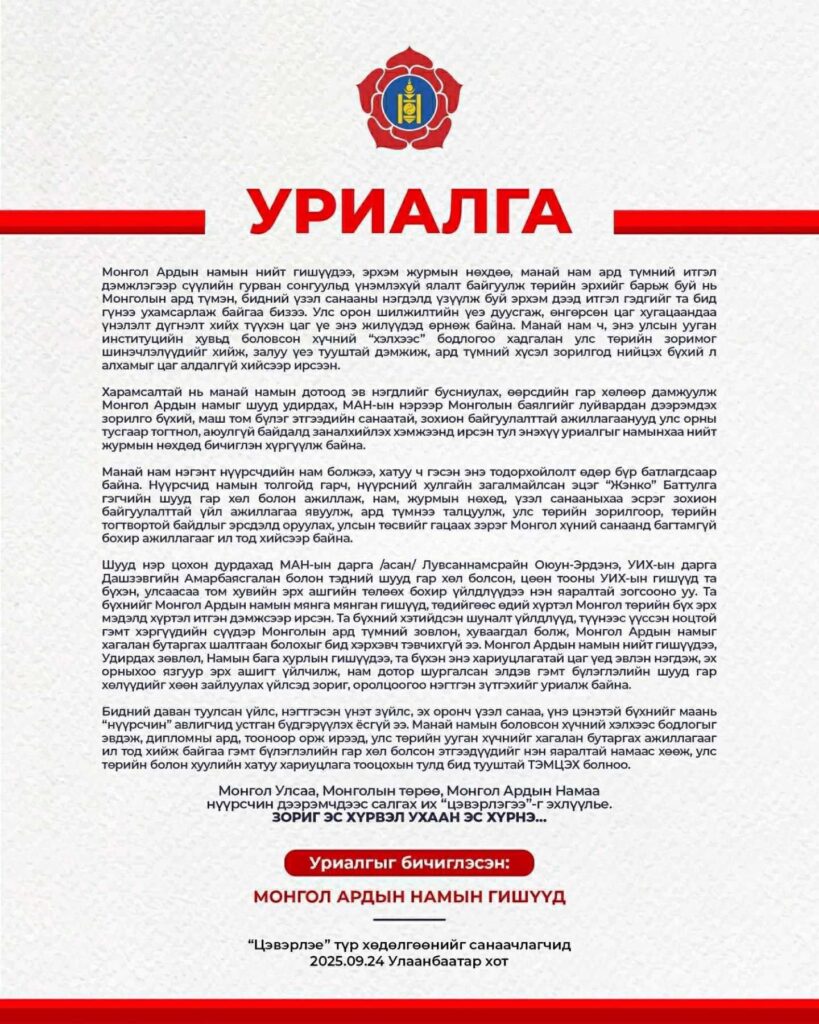 МАН-ын бага хурал ирэх бямба гарагт болж, намын шинэ даргаа сонгоно. Одоогийн байдлаар УИХ-ын дарга Д.Амарбаясгалан өрсөлдөнө гэдгээ зарласан. Намын дарга нь Ерөнхий сайд байх дүрэмтэй гэдэг утгаараа гүйцэтгэх засаглалын тэргүүн Г.Занданшатар ч өрсөлдөнө. Тэгвэл МАН-ын жолоог цаашид хэн атгах нь тус нам дотор хагарал үүсгэн, гишүүд нь талцан хуваагдах үндэс болоод байгаа тухай тус намын гишүүд байр сууриа илэрхийлж, мэдэгдэл гаргажээ. Уг мэдэгдэлд МАН- ын гишүүд нэгдэж “Цэвэрлэе” хөдөлгөөн өрнүүлж, намыг хуваах алхам өрнүүлж байгаа экс Ерөнхий сайд Л.Оюун-Эрдэнэ, УИХ-ын дарга Д.Амарбаясгалан нарыг хөөх тухай агуулга илэрхийлжээ. “Цэвэрлэе” хөдөлгөөнийхөнд МАН- ын хэчнээн гишүүн нэгдсэн, хэн уг хөдөлгөөнийг эхлүүлсэн гэх мэт мэдээлэл тодорхой биш байна.