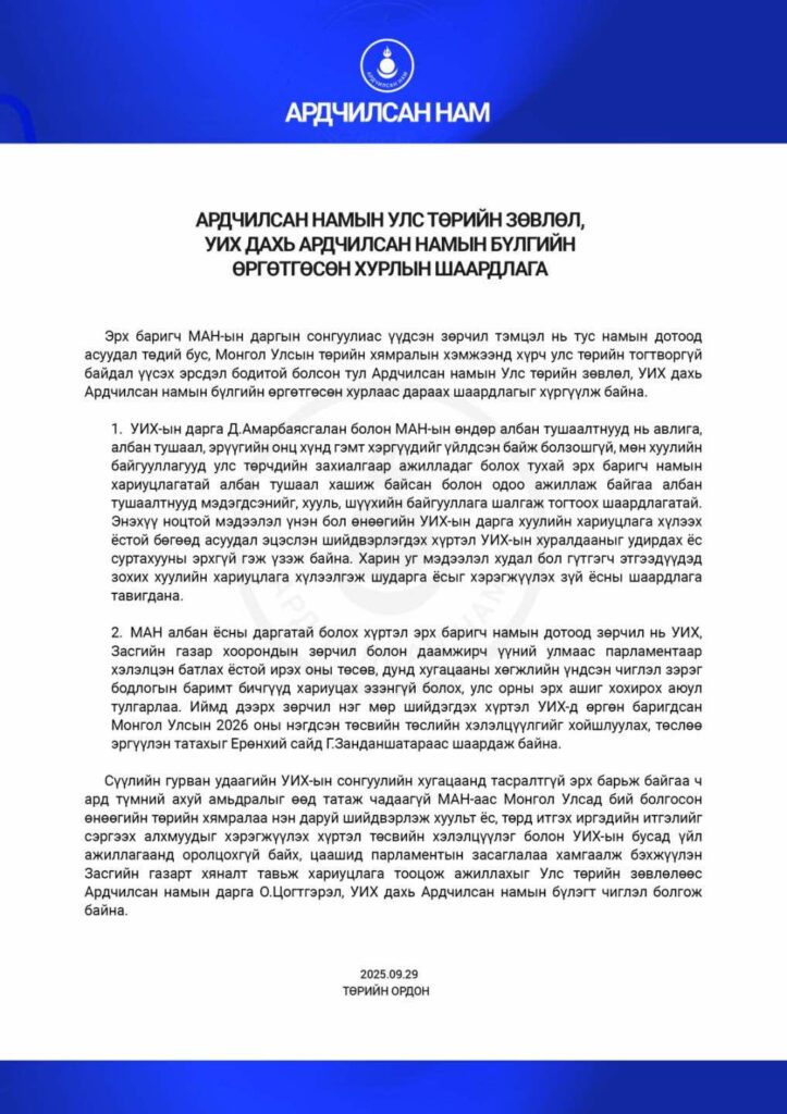 2. МАН албан ёсны даргатай болох хүртэл эрх баригч намын дотоод зөрчил нь УИХ, Засгийн газар хоорондын зөрчил болон даамжирч үүний улмаас парламентаар хэлэлцэн батлах ёстой ирэх оны төсөв, дунд хугацааны хөгжлийн үндсэн чиглэл зэрэг бодлогын баримт бичгүүд хариуцах эзэнгүй болох, улс орны эрх ашиг хохирох аюул тулгарлаа. Иймд дээрх зөрчил нэг мөр шийдэгдэх хүртэл УИХ-д өргөн баригдсан Монгол Улсын 2026 оны нэгдсэн төсвийн төслийн хэлэлцүүлгийг хойшлуулах, төслөө эргүүлэн татахыг Ерөнхий сайд Г.Занданшатараас шаардаж байна.