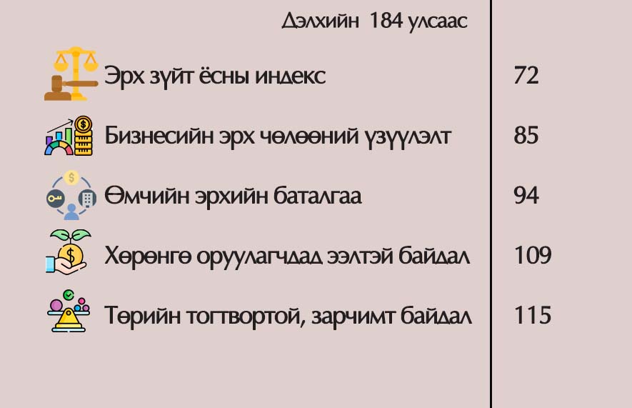 Эдийн засагт эрх чөлөө олгох хуулийн төслийг олон нийтэд танилцуулж байна. Монгол Улсын хөрөнгө оруулалт, бизнесийн орчны үзүүлэлтүүд Дэлхийн 184 орноос дараах байдлаар эрэмбэлэгдэж байна.