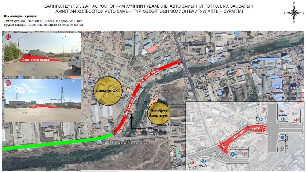 Иймд иргэд, жолооч та бүхэн дээрх хугацаанд бусад гудамж замыг сонгож, замын хөдөлгөөнд оролцоно уу гэж нийслэлийн Замын хөгжлийн газраас мэдээллээ.