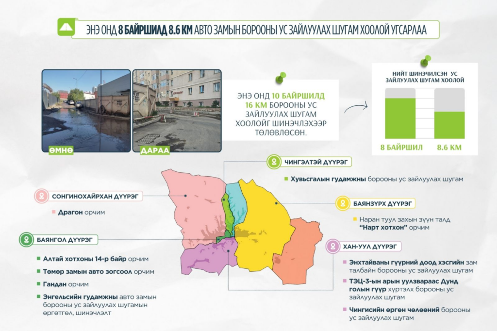 Харин 2026 онд ГУББГ-аас ус тогтдог байршлуудад борооны ус зайлуулах нийт 30 км шугам угсрахаар төлөвлөөд байна.