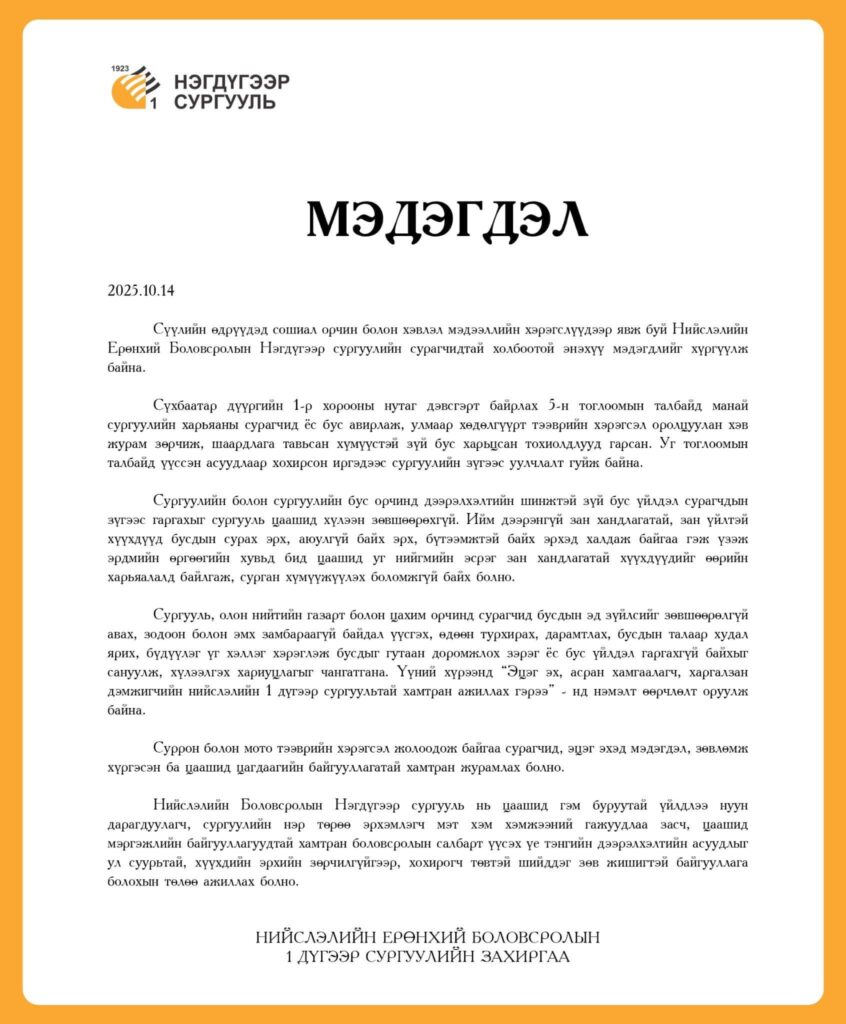 Сар орчим хугацаанд бусадтай бүдүүлэг дээрэнгүй харилцсан сурагчдаа өмгөөлж байсан Ерөнхий боловсролын 1-р сургуулийн захиргаа мэдэгдэл гаргажээ. Уг мэдэгдэлд тус сургуулийн зарим сурагчдын гаргасан зүй бус үйлдлээс болж хохирсон иргэдээс уучлал хүсэж байгаагаа илэрхийлсэн байна. Түүнчлэн 1-р сургуулийн багш ажилтнууд үе тэнгийн дээрэлхэлтийн эсрэг ажиллахаа мэдэгдэж, ёс бус үйлдэл гаргасан сурагчдыг сурган хүмүүжүүлэхгүй байх зарчим баримтлахаа мэдэгджээ.