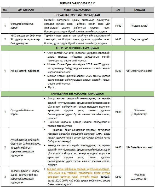 Өнөөдөр УИХ дахь ажлын хэсэг, түр хороо, байнгын хорооны хуралтай. Түр хорооны хурлаар “Оюутолгой” ХХК-ийн Төлөөлөн удирдах зөвлөлийн дарга, гишүүд, гүйцэтгэх удирдлагын багийн танилцуулга, мэдээллийг сонсох аж. Харин байнгын хорооны хуралдаанаар ахмад настны тэтгэврийг нэмэгдүүлэх, тэтгэврийн зээлийн хүүг бууруулах, эрүүл мэндийн болон асрах үйлчилгээг сайжруулах талаар иргэдээс ирүүлсэн өргөдийг судлан үзэж, санал дүгнэлт боловсруулах үүрэг бүхий ажлын хэсгийн санал дүгнэлтийг хэлэлцэх юм байна.
