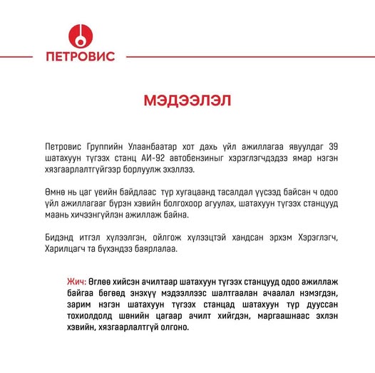 Харин өнөөдрөөс Петровис компани АИ-92 автобензинийг хэрэглэгчдэдээ ямар нэгэн хязгаарлалтгүйгээр борлуулж эхэллээ.