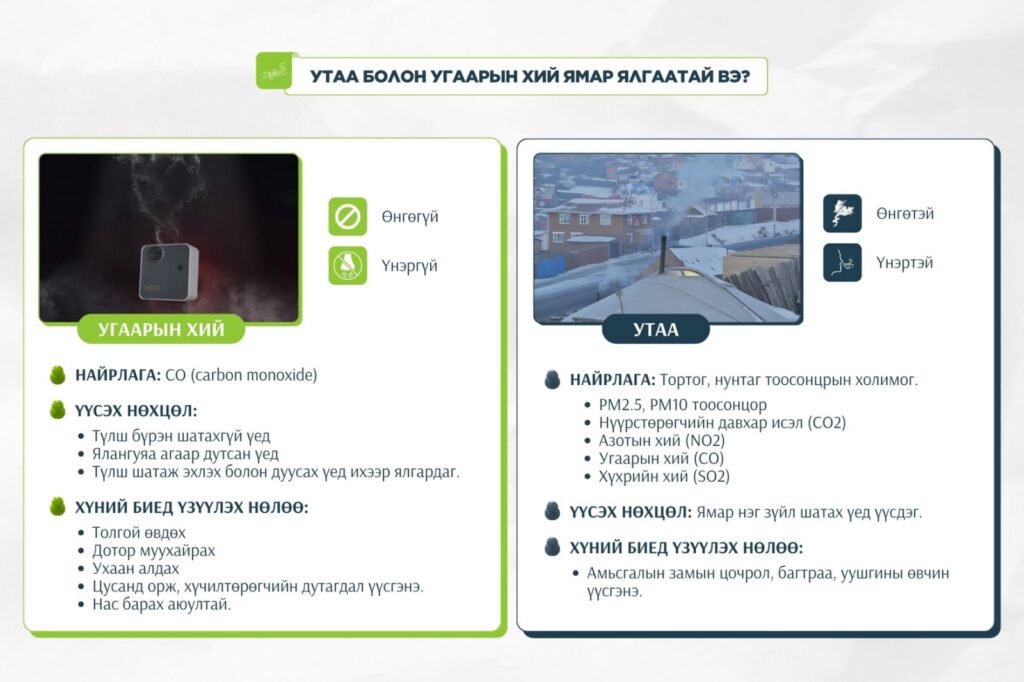Нийслэлийн 120.000 гаруй айлын угаарын хий мэдрэгч төхөөрөмжөөс ирж буй мэдээллийг Түлш хэрэглэгчдэд үйлчлэх төв хянаж, угаарын хий ялгарсан тохиолдол бүрт сэрэмжлүүлэг зөвлөгөө өгч ажилладаг. Иргэд утаа болон угаарыг ялгахгүй байгаа талаар тус төвийн операторууд хэлж байна. Хүчилтөрөгч дутмаг орчинд дутуу шаталтаас болж үүсдэг зүйлийг угаар гэж нэрлэдэг. Ямар ч өнгө, үнэргүй. Иргэдэд гэрт нь угаарын хий ялгарсан талаар мэдээлэл өгөөд залгахаар манайд юу ч үнэртэхгүй байна, утаа гаргаагүй, байн байн битгий залгаад бай гэж хэлэх тохиолдол гардаг аж. Агаар сэлгэлт хийгээгүй, битүү орчинд хүн угаартах эрсдэлтэй байдаг. Тийм болохоор яндан зуухыг тогтмол хөөлөх, зуухны ам тагийг сайтар хаах, гал түлэхдээ сойлтоо хаахгүй байхыг зөвлөж байна. Мөн угаарын хий ялгарч, төхөөрөмж дуугарвал төхөөрөмжийг дуугарахаа больтол нь агаар сэлгэх нь чухал юм.