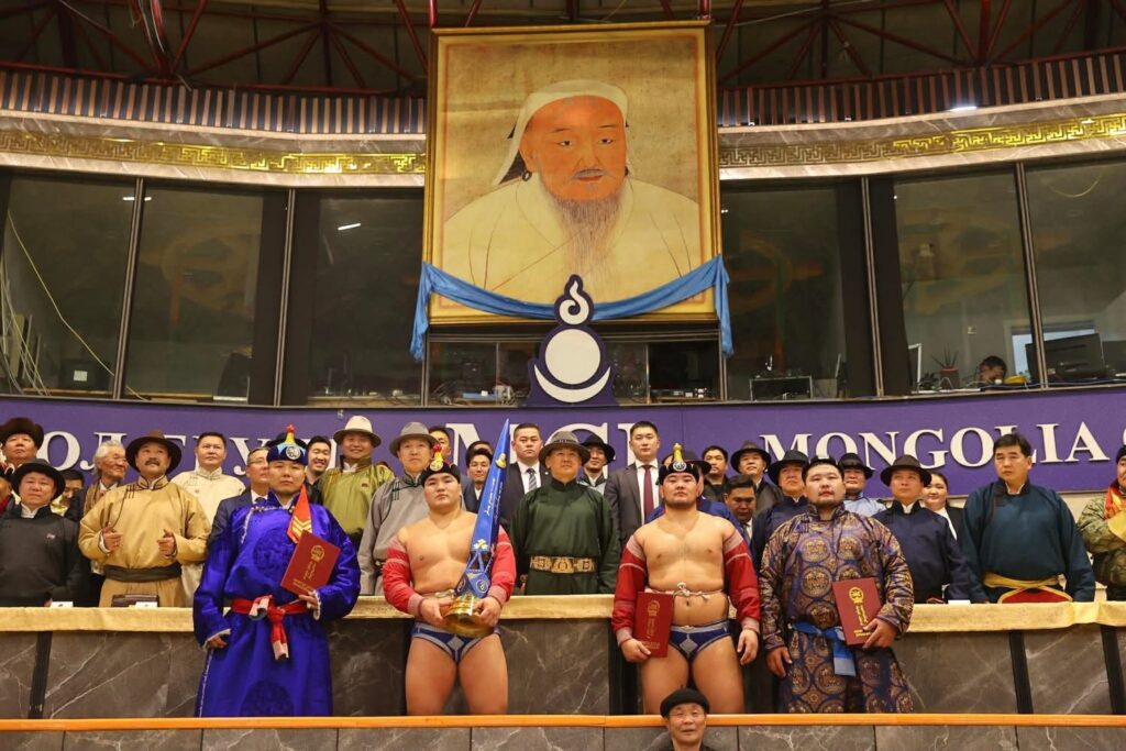 Монгол Улсын Ерөнхийлөгч Ухнаагийн Хүрэлсүх Улсын арслан Э.Батмагнайд Монгол Улсын Ерөнхийлөгчийн нэрэмжит “Чингис хаан” цомыг гардуулж, баяр хүргэлээ. Монгол Улсын Ерөнхийлөгчийн 2024 оны 11 дүгээр сарын 02-ны өдрийн 165 дугаар зарлигийн дагуу “Монгол бахархлын өдөр”-т зориулсан барилдаанд түрүүлсэн бөхөд “Чингис хаан” цомыг гардуулж байхаар шийдвэрлэсэн юм.