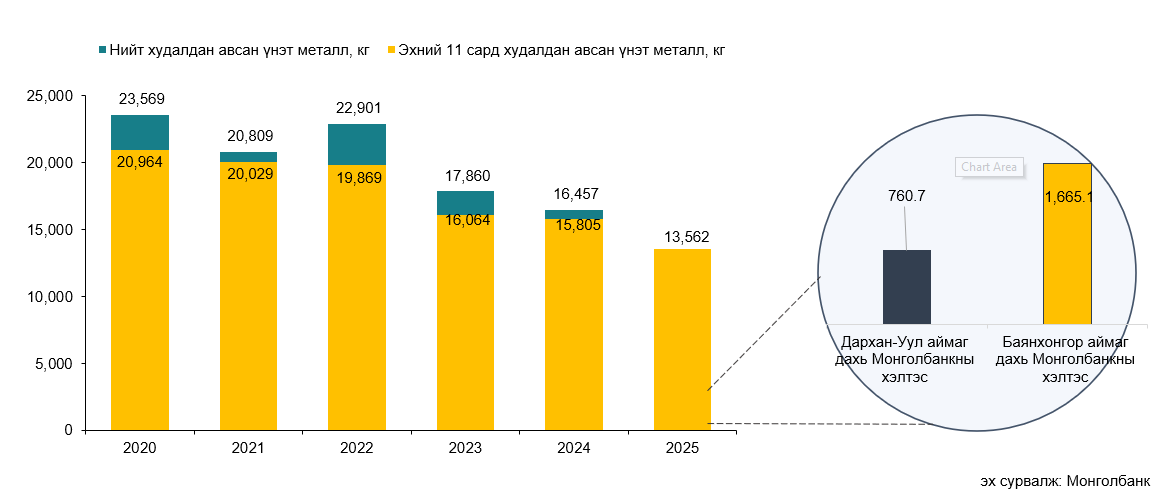 Монголбанк 2025 оны 11 дүгээр сард 899.5 кг, оны эхнээс өссөн дүнгээр нийт 13.6 тонн үнэт металл худалдан авчээ. Үнээс Дархан-Уул аймаг дахь Монголбанкны хэлтэс 760.7 кг, Баянхонгор аймаг дахь Монголбанкны хэлтэс 1,665.1 кг үнэт металл худалдан авсан байна. Энэ нь өмнөх оны мөн үетэй харьцуулбал 14.2 хувиар буурсан үзүүлэлт.