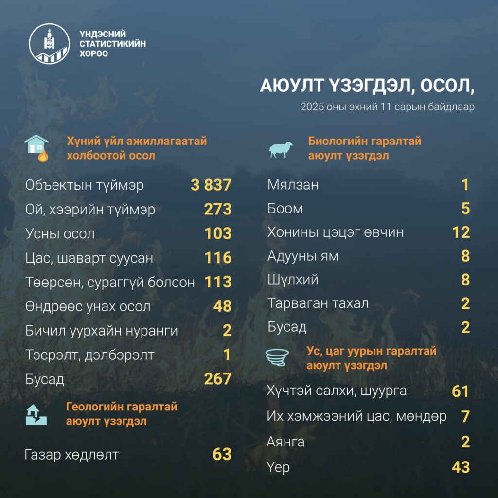Он гарсаар 2025 оны эхний 11 сарын байдлаар аюулт үзэгдэл, ослын тохиолдол 4974 удаа бүртгэгдэж, өмнөх оны мөн үеэс 64 (1.3%)-өөр өссөн байна.