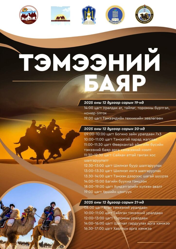 Өвөрхангай аймгийн Гучин-Ус суманд ирэх амралтын өдрүүд буюу 12 дугаар сарын 20-21-нд Тэмээний баяртай. “Мөнгөн буйл” тэмээчдийн холбоо, “Тэмээчдийн Монголын хоолой” холбоо, Гучин-Ус сумын ЗДТГ хамтран уг баярыг зохион байгуулж байна. Уг баярын хөтөлбөрийг танилцуулъя.