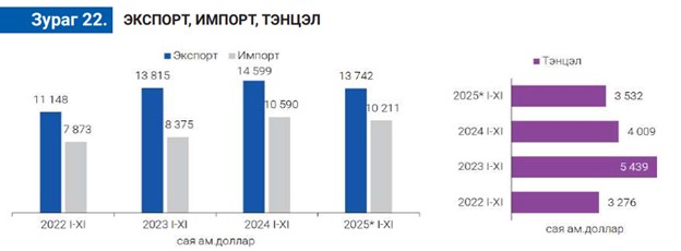 Монгол Улс 2025 оны эхний 11 сард нийт 161 улстай худалдаа хийж, гадаад худалдааны нийт бараа эргэлт 24.0 тэрбум ам.доллар болсон байна. Үүнээс экспорт 13.7 тэрбум ам.доллар, импорт 10.2 тэрбум ам.доллар болж, тэнцэл 3.5 тэрбум ам.долларын ашигтай гарчээ. Харин нийт бараа эргэлтийн хэмжээ өмнөх оны мөн үеэс 1.2 /4.9%/ тэрбум ам.доллар, экспорт 856.5 /5.9%/ сая ам.доллар, импорт 379.0 /3.6%/ сая ам.доллар, тэнцэл 477.6 /11.9%/ сая ам.доллароор тус тус буурсан байна.