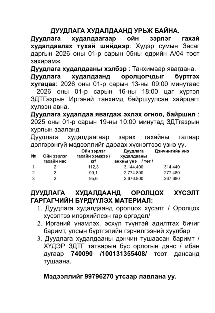 Дуудлага худалдаа 2026 оны нэгдүгээр сарын 19-ний өдрийн 10:00 цагт ЗДТГ-н хурлын танхимд болох аж.