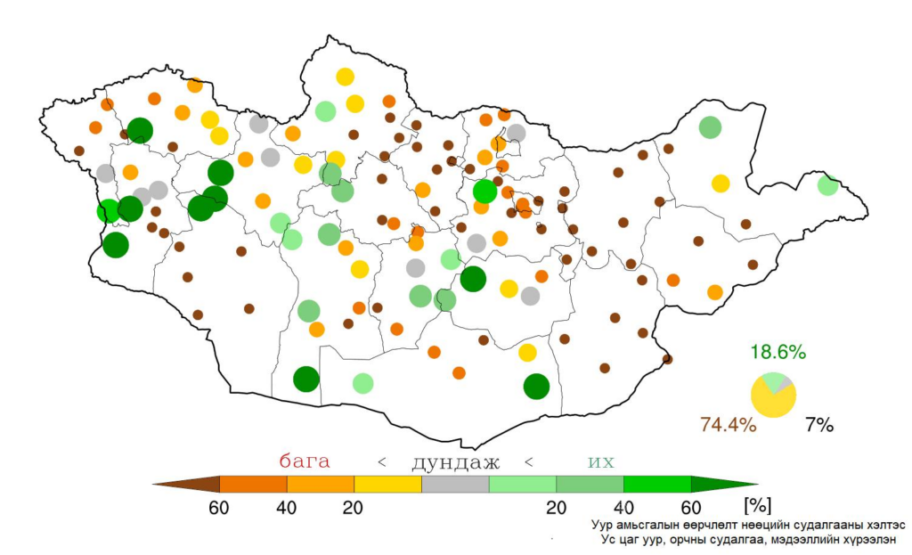 Цаг уур орчны шинжилгээний газраас өнгөрөгч 12-р сарын цаг агаарын нөхцөл байдлын талаар мэдээллээ. Тодруулбал, 2025 оны 12 дугаар сард Монгол орны хэмжээнд дунджаар 1.6 мм тунадас орсон байна. Энэ нь өмнөх жилээс 55.8 хувиар, ОЖД-аас 47.3 хувиар тус тус бага хур тунадас орсон ба 1940 оноос хойш тохиолдож байгаа 19 дэх бага тунадастай сар болж өнгөрлөө. Сарын нийлбэр хур тунадасны ОЖД-аас хазайх хазайлтын орон зайн тархалтыг авч үзвэл нийт нутгийн 74.4 хувь нь дунджаас бага, 7.0 хувь нь дунджийн орчим, 18.6 хувь нь ахиу тунадас унасан байна.