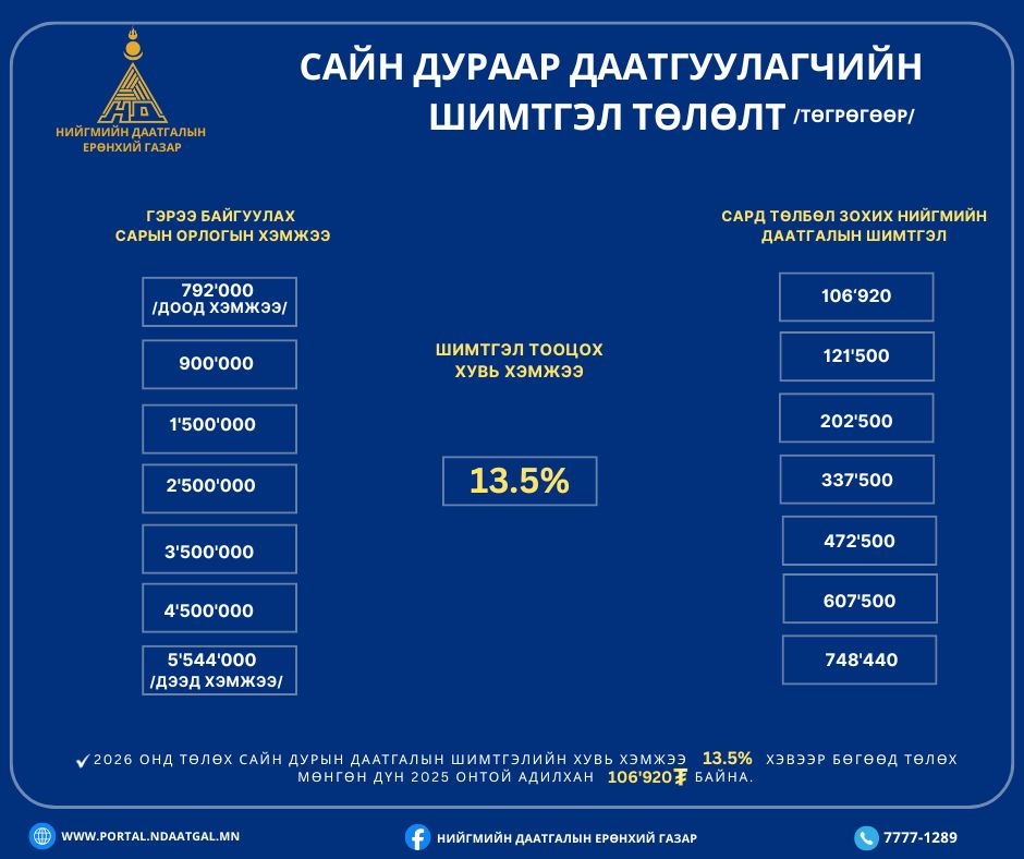 2026 онд сайн дураар НДС-д даатгуулах иргэнээс авах шимтгэлийг нэмээгүй. 13.5 хувь хэвээрээ байгаа. Даатгуулагч өөрийн мэдүүлсэн хөдөлмөрийн хөлс, орлогынхоо 13.5 хувийг Нийгмийн даатгалын санд шимтгэл болгож төлнө. Тухайн сард төлөх нийгмийн даатгалын шимтгэлийн хэмжээ нь хөдөлмөрийн хөлсний доод хэмжээнээс шалтгаалдаг. Иймд 2026 онд хамгийн бага хэмжээгээр шимтгэл төлөх даатгуулагч 792.000 төгрөгийн 13.5 хувь болох 106.920 төгрөг төлөх юм.