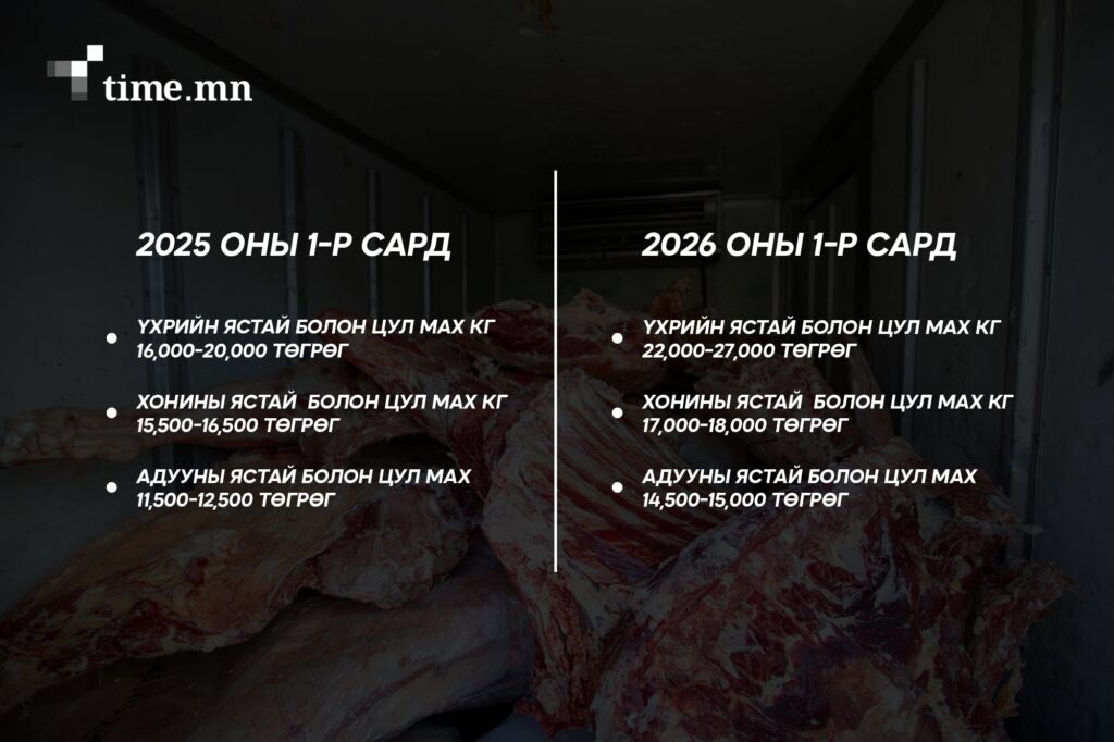 Тэгвэл 2025 оны энэ үед махны үнэ ямар байсан талаар Үндэсний статистикийн хорооноос гаргасан судалгаа харуулав. Харин 2026 оны 1-р сард үхрийн махны үнэ 6000-8000 төгрөгөөр нэмэгджээ.