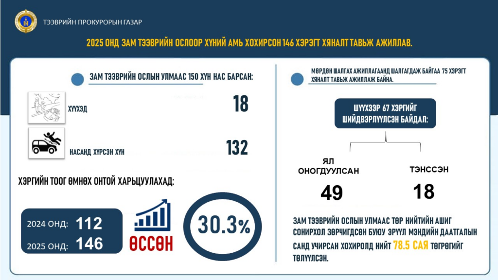 Тээврийн прокурорын газраас зам тээврийн ослын улмаас хүний амь нас хохирсон гомдол, мэдээлэл, эрүүгийн хэрэгт хяналт тавьж ажилласан ба шүүхэд шилжүүлсэн хэргээс анхан шатны шүүх 18 хэрэгт тэнсэх, 49 хэрэгт ял оногдуулж шийдвэрлэсэн байна. Одоогоор 75 хэрэг шалгах ажиллагаа хийгдэж байгаа аж. Түүнээс гадна судалгааны дүнгээс үзэхэд “Зам тээврийн ослын улмаас хүний амь нас хохирсон” хэрэгт бүрэн дунд болон дээд боловсролтой, хөдөлмөр эрхэлдэг хүмүүс зонхилон холбогджээ.