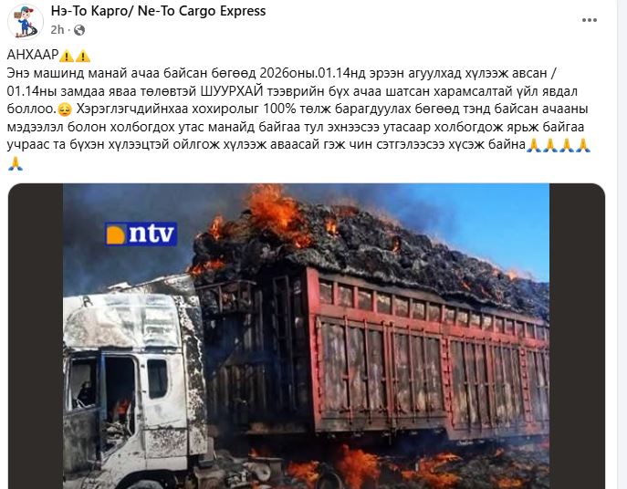 Уг машинд ачсан барааны дийлэнх нь “Нэ-То” каргоны 1-р сарын 14-ний бараа байжээ. Тус карго “Үйлчлүүлэгчдийн хохирлыг бүрэн барагдуулна” гэдгээ мэдэгдээд байна. Одоогоор тус каргоны ажилчид ачааны эзэдтэй холбогдож байгаа юм.