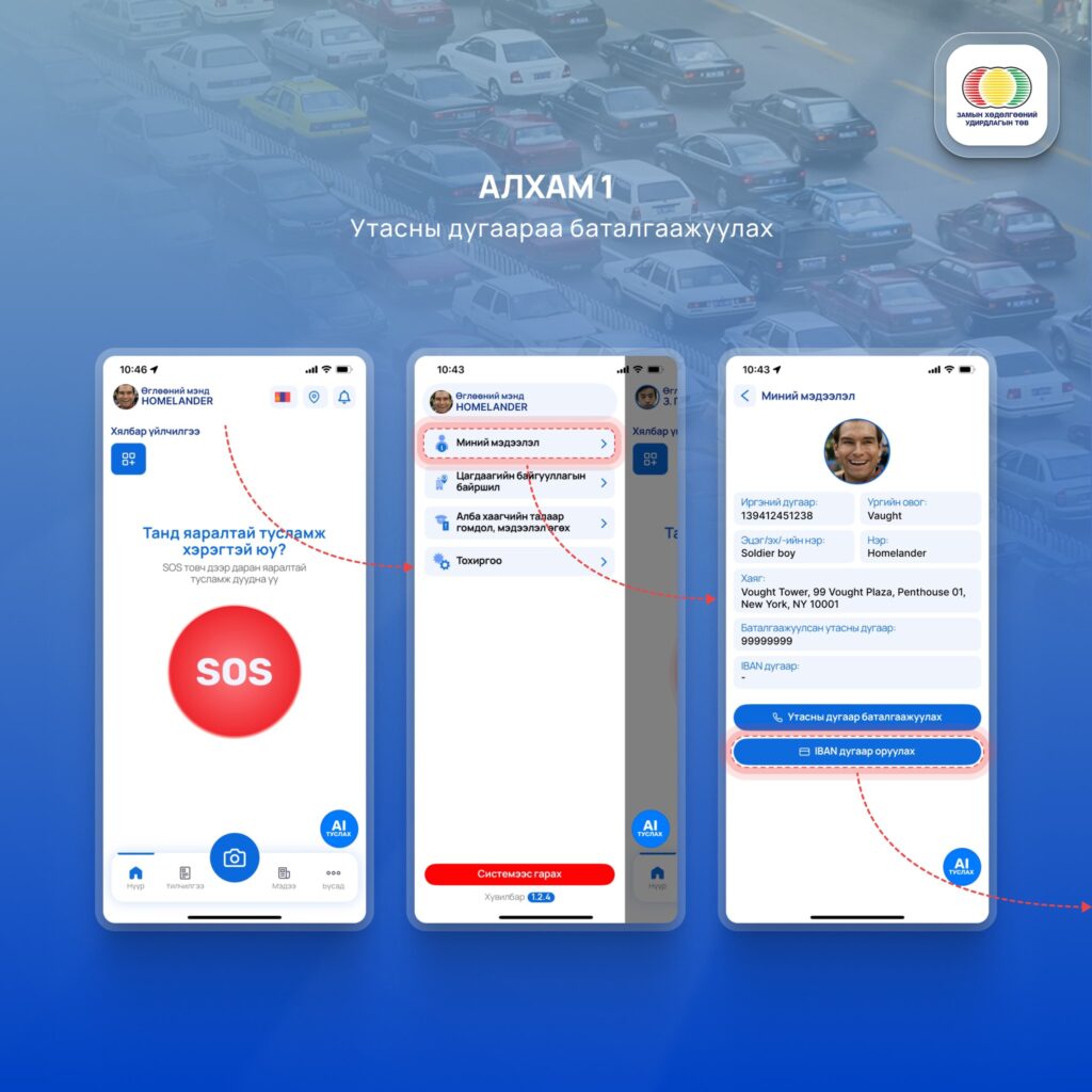 - Алхам 1: “102 Police” аппликэйшнд нэвтэрч “Миний мэдээлэл” хэсэгт утасны дугаараа баталгаажуулж, IBAN дугаараа оруулна.