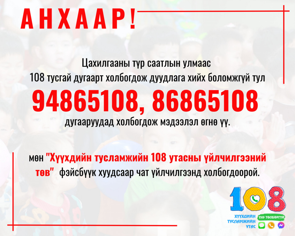 Хүүхдийн шуурхай тусламж, хамгааллын 108 төвийн дугаар цахилгааны хязгаарлалтын улмаас түр хугацаанд ажиллахгүй талаар тус төвөөс мэдээллээ. “Өнөөдөр /2026.01.20/ өдрийн 12:45 цагаас хойш 108 шугам дуудлага хүлээн авах боломжгүй тул хүүхдийн эрх зөрчигдсөн хүүхэд хамгааллын дуудлага мэдээллийг,