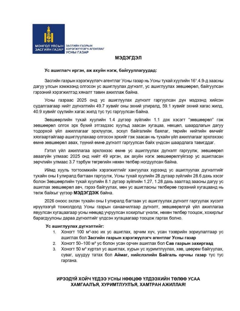 Үйл ажиллагаа эрхлэхээсээ өмнө ус ашиглуулах дүгнэлт гаргуулж, зөвшөөрөл аваагүйн улмаас 2025 онд нийт 49 иргэн, аж, ахуйн нэгж зөвшөөрөлгүй ус ашиглажээ. Тэдэнд 3.7 тэрбум төгрөгийн нөхөн төлбөр ногдуулсан байна.