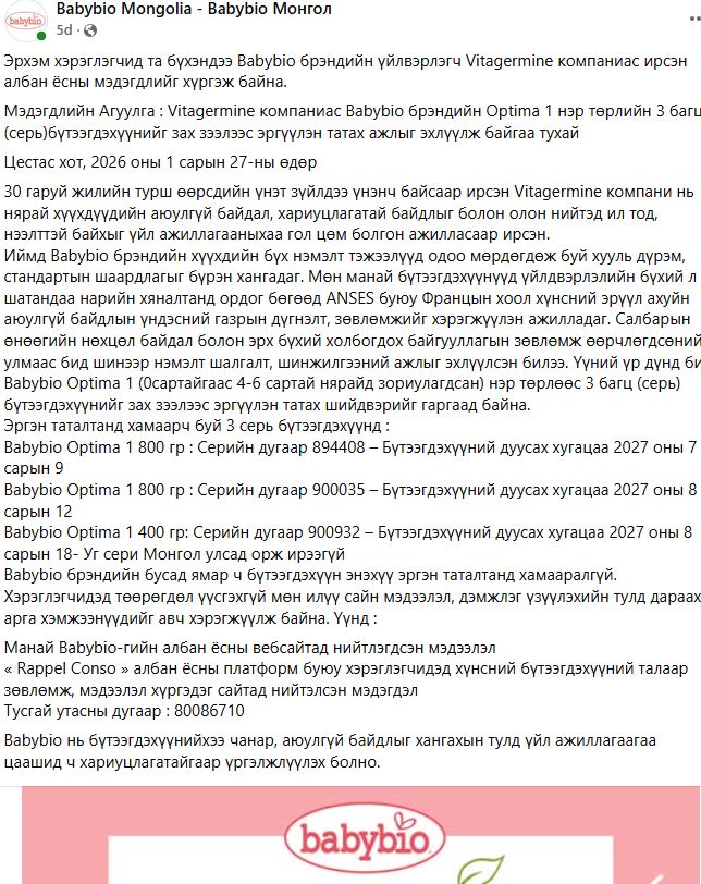 Дээр дурдсан цувралын дугаартай “BABYBIO” брэндийн “Optima 1” нялхсын сүүн тэжээлийг худалдан авч, хэрэглэхгүй байхыг дахин анхааруулж байна. Өнөөдрийн байдлаар Дэлхийн улс орнуудад уг бүтээгдэхүүнтэй холбоотой хүнсний хордлого бүртгэгдээгүй байгаа ч Монгол Улсын зах зээлд нийлүүлэгдсэн “BABYBIO” “Optima 1” нэр төрлийн дараах 2 цувралын бүтээгдэхүүнийг “Vitagermine” компанийн 2026 оны 01 дүгээр сарын 25-ны өдрийн шийдвэрийн дагуу сайн дурын үндсэн дээр зах зээлээс буцаах болон татан авч байгаа гэх мэдэгдэл гаргажээ.