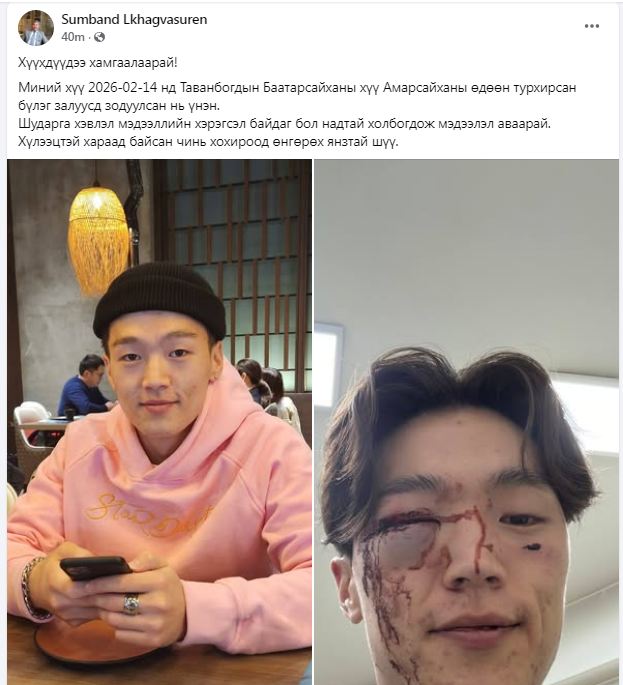 Миний хүү 2026 оны 2-р сарын 14-нд “Таванбогд”-ын Баатарсайханы хүү Амарсайханы өдөөн турхирсан бүлэг залууст зодуулсан нь үнэн. Шударга хэвлэл мэдээллийн хэрэгсэл байдаг бол надтай холбогдож, мэдээлэл аваарай. Хүлээцтэй хараад байсан чинь хохироод өнгөрөх янзтай шүү.