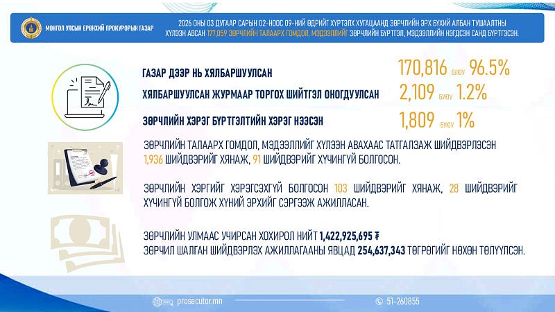 Прокурорын байгууллага 2026 оны 03 дугаар сарын 02-ны өдрөөс 09-ний өдрийг хүртэл хугацаанд улсын хэмжээнд зөрчил шалган шийдвэрлэх эрх бүхий албан тушаалтны хүлээн авсан 177,059 зөрчлийн талаарх гомдол, мэдээллийг Зөрчлийн бүртгэл, мэдээллийн нэгдсэн санд бүртгэсэн байна.