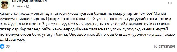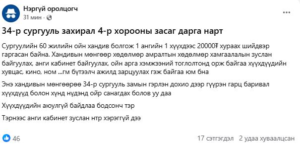 Нийслэлийн ерөнхий боловсролын 34-р сургуулийн 60 жилийн ой өнөө жил тохиож байгаа аж. Уг ойтой холбогдуулан хандив болгож, сурагч бүрээс 20 мянган төгрөг хурааж байгаа гэнэ. Тус сургууль 6000 гаруй сурагчтай. “Хандивын мөнгөөр зуслан болон анги кабинет байгуулах, ойн арга хэмжээний тоглолтод оролцож буй хүүхдүүдийн хувцас, кино, ном гэх мэт бүтээлч ажилд зарцуулна” хэмээн эцэг эхчүүдэд мэдэгджээ.