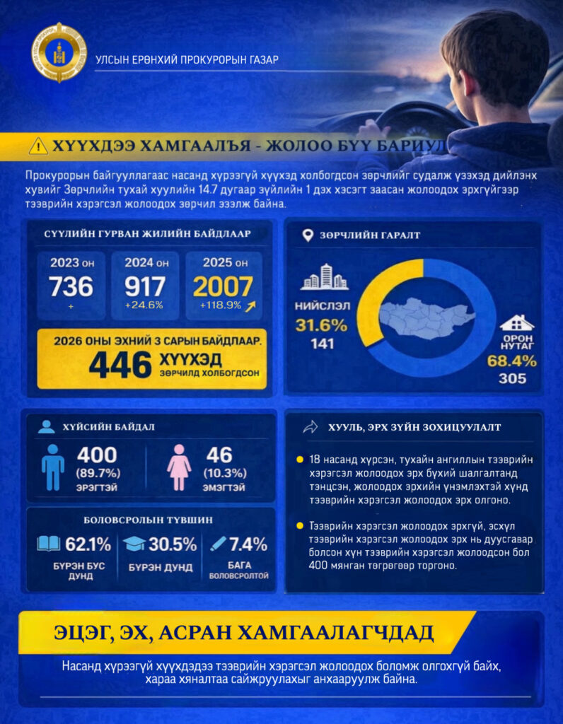 Эрх бүхий албан тушаалтнаас 2026 оны эхний гурван сарын байдлаар жолоодох эрхгүйгээр тээврийн хэрэгсэл жолоодсон зөрчил үйлдсэн насанд хүрээгүй нийт 446 холбогдогчид шийтгэл оногдуулжээ.