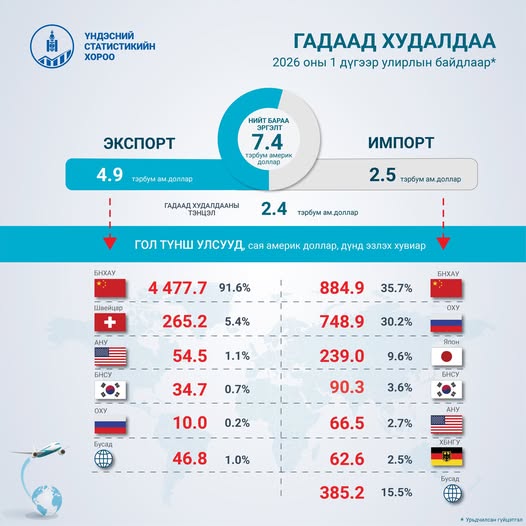 Монгол Улс 2026 оны эхний 3 сард нийт 143 улстай худалдаа хийжээ. Улмаар гадаад худалдааны нийт бараа эргэлт 7.4 тэрбум ам.доллар болсныг Үндэсний статистикийн хорооноос мэдээллээ. Үүнээс экспорт 4.9 тэрбум ам.доллар, импорт 2.5 тэрбум ам.доллар болж, тэнцэл 2.4 тэрбум ам.долларын ашигтай гарчээ. Нийт бараа эргэлтийн хэмжээ өмнөх оны мөн үеэс 1.8 тэрбум ам.доллар буюу 32.5 хувь, экспорт 1.9 тэрбум ам.доллар 62.3 хувь, тэнцэл 1.9 тэрбум ам.доллароор тус тус өсөж, импорт 68.3 сая ам.доллароор буурсан байна.