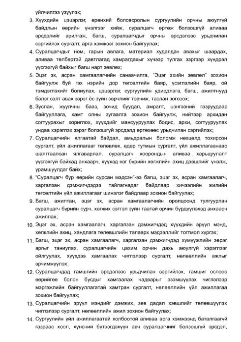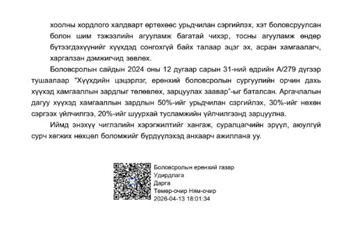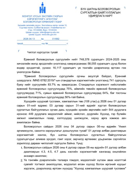 Ерөнхий боловсролын сургуульд нийт 748,378 суралцагч 2024-2025 оны хичээлийн жилд эрсдэлийн үнэлгээнд хамрагдсанаас 58,055 суралцагч дунд болон өндөр эрсдэлтэй, үүнээс 16,117 суралцагч үе тэнгийн дээрэлхэлд өртсөн гэж үнэлэгдсэн байна. Үнэлгээнд 741 сургууль буюу нийт сургуулийн 83.7 хувь нь хамрагдсан. Стандартын хэрэгжилт нийслэлийн ерөнхий боловсролын сургуулиудад 75 хувь, аймгийн төвийн ерөнхий боловсролын сургуулиудад 71 хувь, сумын ерөнхий боловсролын сургуулиудад 64 хувь, баг тосгоны ерөнхий боловсролын сургуулиудад 56 хувьтай байна. Хүүхдийн шуурхай тусламж, хамгааллын төвийн 108 утсанд 2026 оны 01-р сарын 01-нээс 03 дугаар сарын 31-ний өдрийг хүртэл боловсролын сургалтын байгууллагын орчин дахь хүүхдийн эрхийн зөрчлийн нийт 544 дуудлага ирснээс 449 дуудлага мэдээллийг аймаг, нийслэл, дүүргийн Хүүхэд, гэр бүлийн хөгжил хамгааллын газар, хэлтсүүдэд шилжүүлж, хариу арга хэмжээ авч ажиллажээ.Иймд Боловсролын сайдын бүх шатны боловсролын, сургалтын байгууллагын суралцагчдыг аливаа эрсдэл, гэмт хэрэг, зөрчилд өртөхөөс урьдчилан сэргийлэх зорилгоор чиглэлийг хүргүүлжээ.