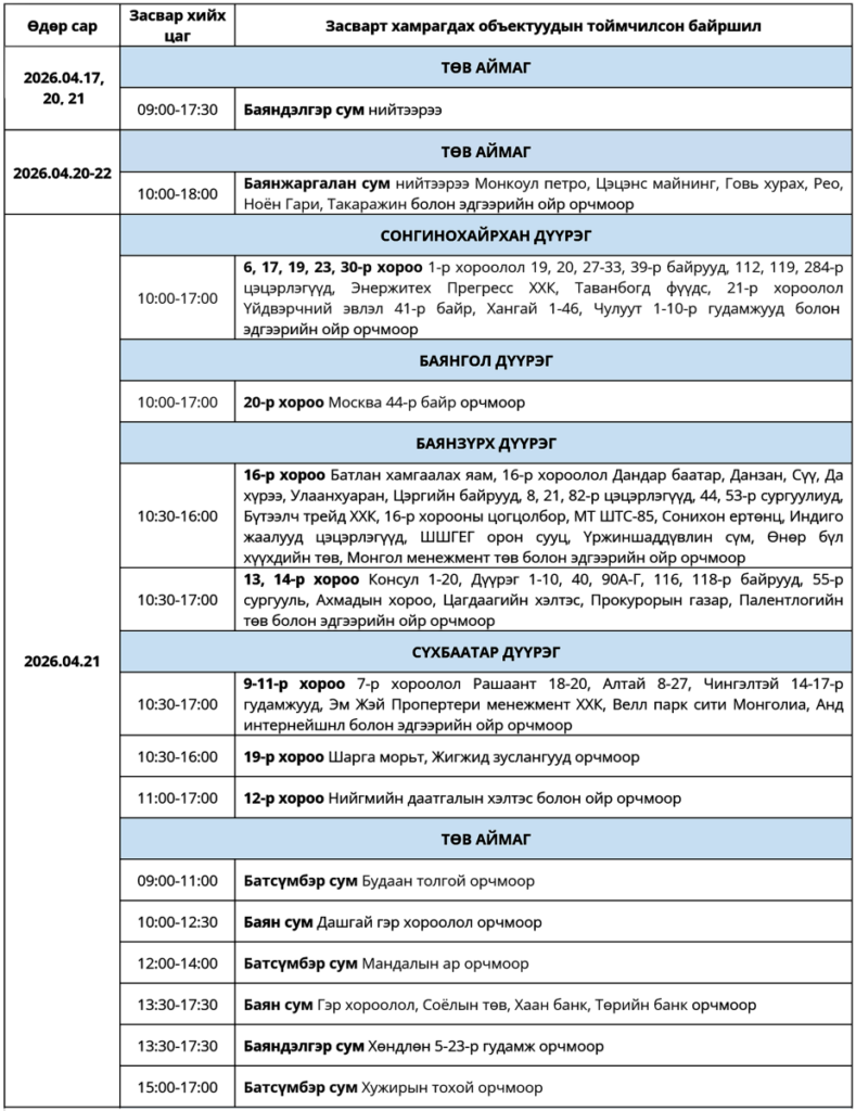 Өнөөдөр буюу 2026 оны дөрөвдүгээр сарын 21-ний Мягмар гарагт цахилгаан шугам сүлжээнд хийх засварын хуваарийг танилцуулж байна.
