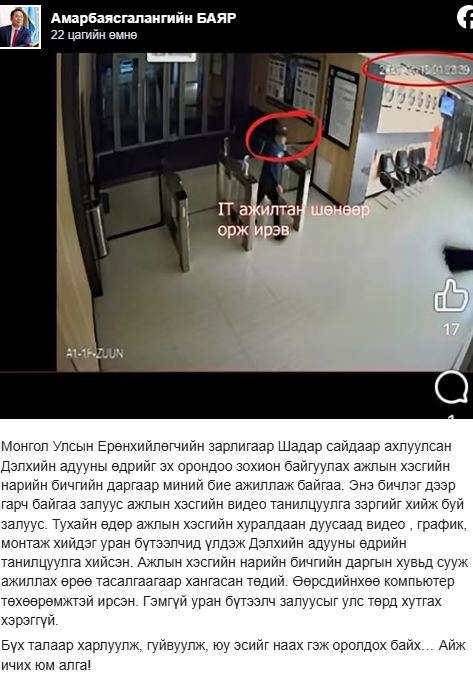 Тухайн өдөр ажлын хэсгийн хуралдаан дуусаад видео, график, монтаж хийдэг уран бүтээлчид үлдэж “Дэлхийн адууны өдөр”-ийн танилцуулга хийсэн. Ажлын хэсгийн нарийн бичгийн даргын хувьд сууж ажиллах өрөө тасалгаагаар хангасан төдий. Өөрсдийнхөө компьютер төхөөрөмжтэй ирсэн. Гэмгүй уран бүтээлч залуусыг улс төрд хутгах хэрэггүй” өөрийн сошиал хаягтаа бичжээ.