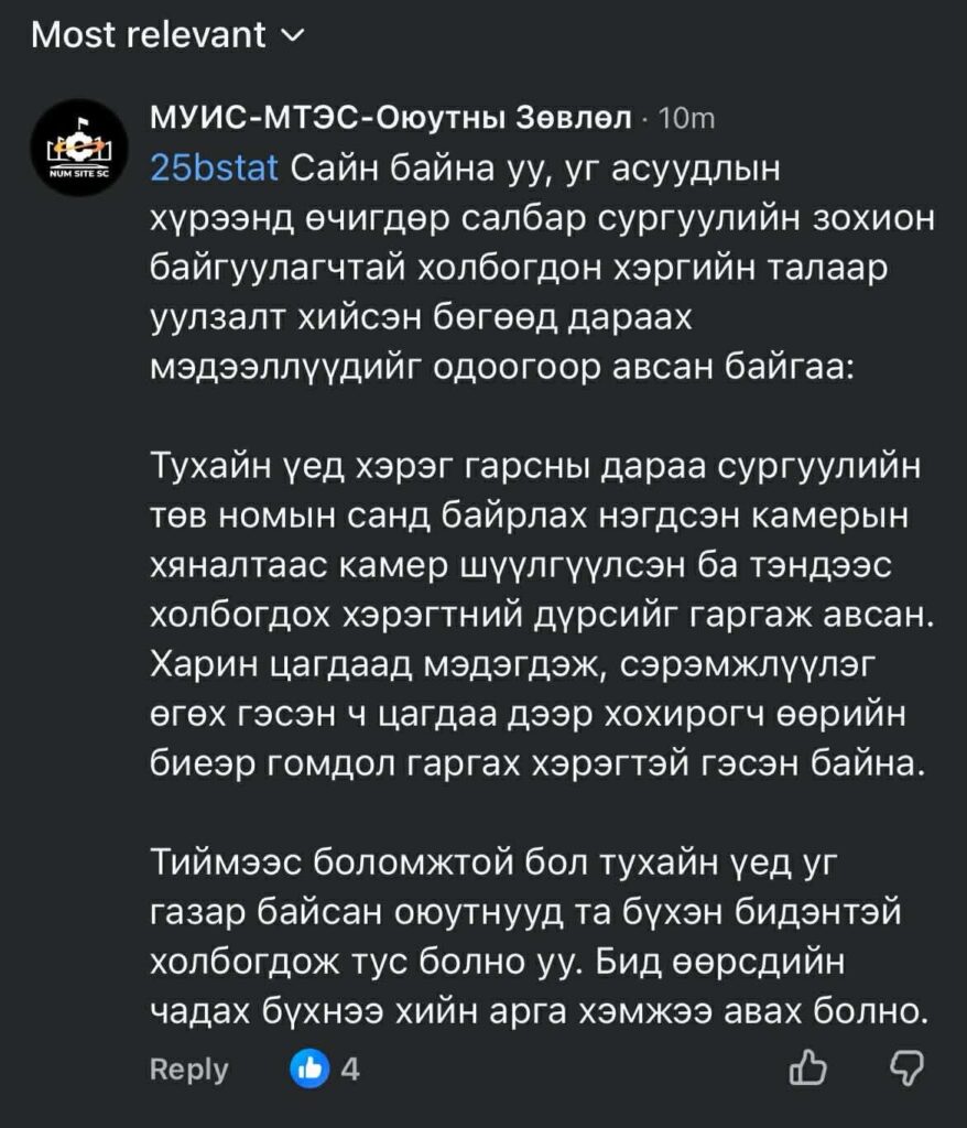 Харин энэ асуудлаар сургуулийн зүгээс уг асуудлын хүрээнд уулзалт хийж сургуулийн төв номын санд байрлах нэгдсэн камерын хяналтаас шүүлгүүлж тухайн хүний дүрсийг авсан. Харин цагдаад мэдэгдсэн ч хохирогчийг өөрийн биеэр ирж гомдол гаргах хэрэгтэй гэсэн.Иймд тухайн асуудал гарах үед байсан оюутнуудтай бид уулзаж байна” гэлээ.